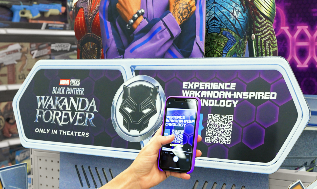 Our response: a multi-touchpoint experience that welcomed and immersed guests with the vibrancy of Wakanda at Target. The promotion featured custom CGI signage made to look like beveled Vibranium–Wakanda’s energy source, a welcome archway with motion activated music and LED hologram, screen-displays inspired by Shuri’s lab, and even an AR experience (made in partnership with Target’s internal team). The installation was a huge success and marked a few firsts for Target: